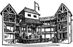 Although the ‘purpose-built’ theatres were based on the inn-yards which had been used for play-acting, most of them were circular. The walls contained galleries on three storeys from which the wealthier patrons watched, they must have been something like the ‘boxes’ in a modern theatre, except that they held much larger numbers – as many as 1500. The ‘groundlings’ stood on the floor of the building, facing a raised stage which projected from the ‘stage-wall’, the main features of which were: