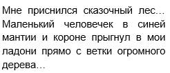 Робин был маленьким эльфом. Когда я сказала маленький, то имела в виду размер примерно в половину вашей ладошки, а может даже и меньше. Наш Робин живёт в сказочном лесу. Представьте себе огромные мачтовые деревья, мощные в основании и, по мере своего возвышения, становящиеся едва заметной точкой в небе. По крайней мере, так казалось рыжеволосому эльфу, когда тот, проснувшись рано утром, выходил на ветку погреться первыми солнечными лучами. Вот и сейчас, он потянулся и, прищурившись голубыми озорными глазками, посмотрел на восход. И когда большая капля росы упала прямо на его курносый нос, щедро одарённый веснушками, Робин вспомнил, что сегодня крайне важный день в жизни чудного народа, живущего на деревьях, и совсем скоро крохотный комочек на спине превратится в грациозные крылья, переливающиеся при свете луны всеми цветами радуги. День посвящения малышей во взрослую, полную всяческих приключений жизнь наступил! Ох, как он того ждал, как мечтал расправить крылья, вдохнув полной грудью ночную прохладу, полететь над бескрайними просторами Страны Фей… Священнодействие начнётся на стыке дня и ночи, во время сумерек. Апогеем праздника станет восход полной луны, и тогда, сотни искрящихся и трепещущих крылышек наполнят таинственным звоном древний лес. В этот момент всё живое, будто склоняясь в торжественном реверансе, отдаст должное почтение вечному таинству жизни.
