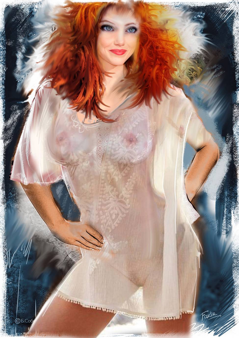 С лица её надлежало пить, пить и пить бесконечно! В огромных озорных раскосых васильковых глазах – вечное безоблачное небо! Ни единого облачка! Прямой почти классический нос, красивые, в то же время твердые, решительные губы, как и широкие скулы с ямочками на щеках, очаровательной, слегка удлинённой формы аккуратные ушки, отнюдь не вносили диссонанс в облик сего удивительно гармоничного творения Создателя, лишь добавляя ещё и ещё чувственности. Море, океан чувственности! Венчала всю эту красотищу копна густых огненно-рыжих непослушных волос. У-у-ух! До чего хороша, чертовка! Слов нет! Одни жесты остались, потому умолкли все разом. Зарруга, гааш!