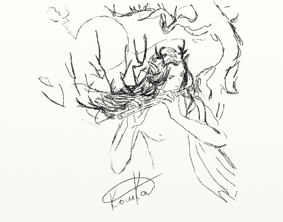 Сквозь кусты, проходя деревья, дух медленно проплыл к зовущему и вожделенному месту. Он не спешил. Он оттягивал удовольствие. Его тонкие изящные руки подняли дудочку. Простая деревянная трубочка с дырочками жадно прижалась к его избалованным губам. Изящно откинув иссини-чёрные, длинные волосы, Фусис на мгновение замер, в предвкушении блаженства и набираясь вдохновения. Его длинные пушистые ресницы прикрывали глаза, погружая лицо в тень. Человек умирал, и дух стремился прожить с ним последнее мгновение.