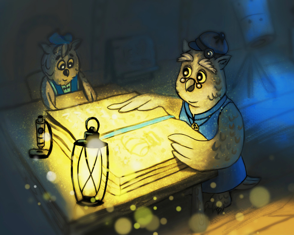 Вечером Альберт был взволнован больше обычного, он суетливо копался в свитках, а потом принёс из библиотеки огромную пыльную книгу и разложил на столе. Записи в книге были сделаны на каком-то странном языке и вдобавок начинали светиться, когда Альберт очищал страницы от пыли. Он достал специальный расшифровщик и начал её изучать. Это было так интересно, что Фили даже приоткрыл клюв от восторга.