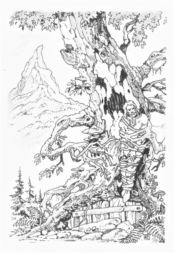 К горе с правильной стороны выбрел, глядь – и впрямь дерево приметное, и дверь у основания имеется. Подошёл Кугыжа ближе, вот тут-то первый сюрприз и случился, не как во сне все пошло. Был в нем знак, конечно, про змей, но не внял ему Кугыжа. Только приблизился к двери – взметнулись корни. Дернулся не успел: спеленали, валашку к телу притиснули, руки заневолили. Ни размахнуться, чтоб рубануть, ни к ножу потянуться. Дышать, честно сказать, и то поди попробуй.