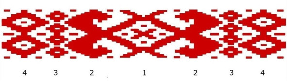 Разъяснение элементов орнамента: 1 – солнце, символ засеянного поля или символ «ключа к счастью» (внутри солнечного ромба); 2 – символы плодородия и богатства (рога изобилия); 3 – символы исполнения желаний (вотивные знаки); 4 – узоры хлеба