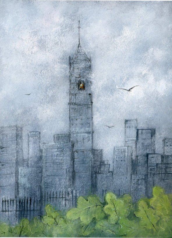 Занятное поселение предстало его очам. Город состоял сплошь из серых домиков, напоминавших башенки, одна выше другой, с плоскими крышами, как сломанные карандаши в стакане, и все одного цвета, обнесенные милыми остроконечными заборчиками. В самом центре башенного частокола виднелось свободное пятно с высоченной колокольней, упиравшейся шпилем чуть ли не в облака.
