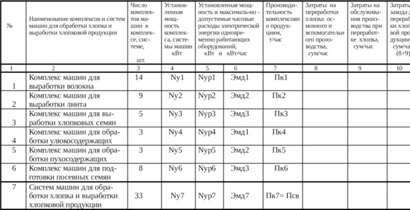 Для определения технико-экономических показателей систем машин по обработке хлопка и выработке хлопковой продукции, таких как установленная мощность, максимально допустимые расходы электрической энергии, производительность и себестоимость переработки хлопковой продукции, а также производственная себестоимость, оптовые цены предприятий, и др. экономических показателей хлопкового комплекса предлагается пользоваться информационно-вычислительной моделью, представленной в виде таблицы (табл. I.1).