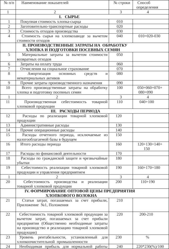 1) учет совокупных затрат на обработку хлопка и подготовку посевных семян, дающий возможность покрывать общие затраты на производство и реализацию всех видов товарной хлопковой продукции включением в побочную продукцию посевных семян;