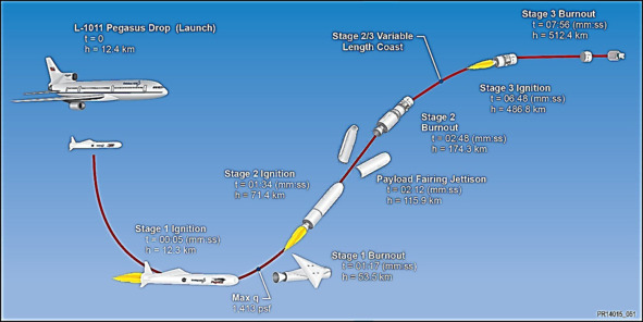Бортовые системы, за исключением самоликвидации, не дублировались. Испытательный полет не предусматривался. Ракета Pegasus длиной 15.5 м представляет собой сборку трех твердотопливных ступеней, из которых первые две имеют диаметр 1.27 м, а третья – 0.96 м. Верхняя ступень с приборным отсеком закрывается двухлепестковым обтекателем с диаметром, соответствующим размеру нижних ступеней.