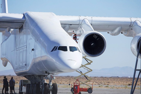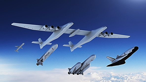 Элементами системы должны были стать огромный самолет-носитель грузоподъемностью 250 т и многоступенчатая орбитальная ракета. Схема полета предусматривает взлет с аэродрома, обладающего достаточно длинной взлетно-посадочной полосой, набор высоты около 10 км, полет в зону пуска и сброс ракеты, которая затем разгоняется собственными двигателями. Проектирование платформы воздушного запуска выполнила компания Scaled Composites, которой руководил Берт Рутан. На базе предыдущих разработок всемирно известный конструктор экспериментальных и рекордных аппаратов предложил двухфюзеляжный самолет со взлетной массой 590 т. Размах его крыла – 117 м – на 30 м больше, чем у самого тяжелого самолета в мире – советского Ан-225 – и на 37 м – чем у крупнейшего пассажирского авиалайнера Airbus А380. Длина фюзеляжей – 73 м. Для перемещения гиганта по аэродрому его оснастили шасси с 28 колесами. Самолёт оснащён шестью двигателями PW4056 фирмы Pratt & Whitney, снятых с двух авиалайнеров Boeing 747—400. От них же заимствованы шасси,