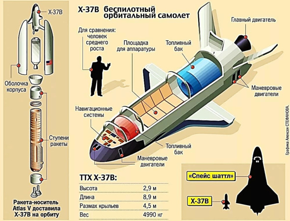 Х-37В – крылатый аппарат со стартовой массой около 5000 кг, имеющий крыло двойной стреловидности, V-образное оперение и трехопорное посадочное шасси. Длина космоплана – 8.92 м, размах крыла – 4.55 м, высота – 2.90 м. В хвостовой части размещен маршевый жидкостный ракетный двигатель AR2—3 фирмы Rocketdyne с тягой около 3 тс, имеются двигатели реактивной системы управления. В орбитальном полете аппарат запитывается от развертываемой солнечной батареи и литий-ионных аккумуляторов. Грузовой отсек с двухстворчатым люком имеет длину 2.1 м при диаметре 1.2 м. Максимальная масса полезного груза, размещаемого в нем, оценивается в 500 кг. Первый испытательный орбитальный пуск состоялся 22 апреля 2010 г. на ракете Atlas V.
