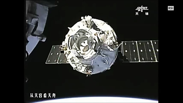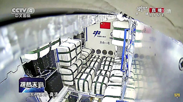 грузовой отсек, который выполнен в форме цилиндра диаметром 3.35 м с передним коническим днищем и переходной конической секцией сзади. На боковых сторонах ПАО на одностепенных приводах установлены две трехсекционные солнечные батареи размахом 14.9 м. Общая длина «Тяньчжоу» – 10.6 м. На передней конической секции смонтирован модернизированный стыковочный узел андрогинно-периферийного типа с тремя внутренними направляющими лепестками. По периферии кольцевого интерфейса установлены четыре разъема для стыковки магистралей перекачки компонентов топлива – два для окислителя по левому борту и два для горючего по правому. Бортовая электросистема 811-го института (г. Шанхай) вырабатывает 2700 Вт от солнечных батарей и использует для хранения заряда литий-ионные аккумуляторные батареи (три блока по 22 аккумулятора). Напряжение бортовой сети – 100 В. На зенитной стороне ПАО установлены два звездных датчика и ориентируемая антенна связи через спутник-ретранслятор. «Тяньчжоу» оснащен бортовым связным комплексом высокой пропускной способности – по сравнению с предыдущей версией она увеличена вчетверо и достигает 1 Гбит/с. В хвостовой части по оси отсека смонтированы четыре двигателя орбитального маневрирования тягой 490 Н. Этим «Тяньчжоу» отличается от «Тяньгуна», у которого их только два. В качестве этих двигателей используются ЖРД второго поколения, применяемые на китайских геостационарных спутниках на платформе DFH-4. Из числа двигателей направленного перемещения тягой 150 и 120 Н четыре смонтировано по периферии хвостового днища ПАО (работают на разгон), четыре