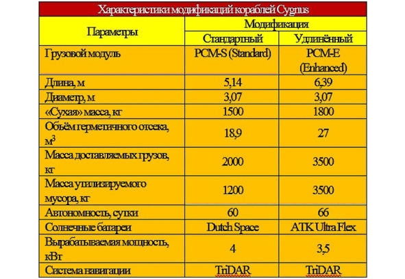 Cygnus состоит из двух цилиндрических отсеков – герметичного грузового модуля PCM (Pressurized Cargo Module) и приборно-агрегатного модуля SM (Service Module). Первый изготовлен фирмой Thales Alenia Space (Италия) на основе Многоцелевого грузового модуля MLM, который применялся совместно с кораблями системы Space Shuttle для доставки герметичных грузов на МКС. Второй построен Orbital АТК на основе собственной спутниковой платформы Geostar и элементов зонда Dawn. Компания-разработчик имела возможность выполнить одну демонстрационную миссию на МКС в рамках программы COTS и в общей сложности восемь рейсов CRS. В первых четырех полетах корабль летал в стандартной конфигурации, с «коротким» модулем PCM-S. Запуск осуществлялся с помощью РН Antares фирмы Orbital АТК, стартующей из космопорта MARS в штате Вирджиния. Когда носитель Antares был усовершенствован путем установки двигателя Castor 30XL в качестве второй ступени, планировалось перейти к расширенной конфигурации с «удлиненным» РСМ-Е,