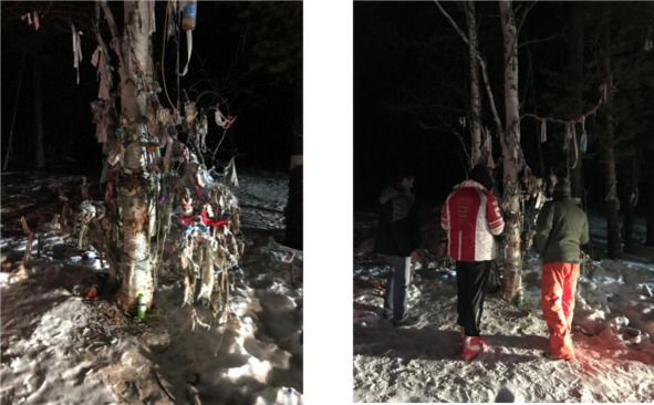 Фото. Жертвенная береза и участники путешествия в прошении о помощи в дороге.
