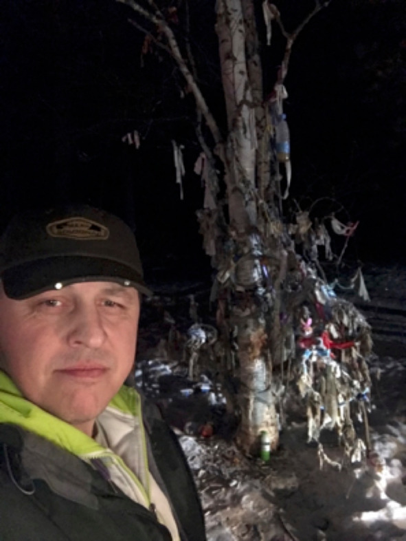 Фото. Олег у жертвенного дерева. Священное место для народов Ханты и Манси по пути в Саранпауль из Сосьвы.