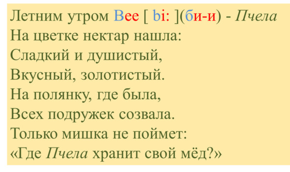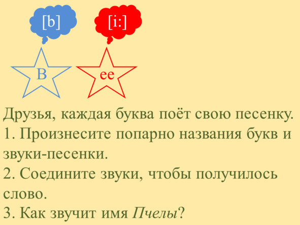 Звуки выстроились один за другим, каждый торопился занять своё любимое место. Они дружно пропели имя Пчёлки: [b] (б) [i: ] (и-и).