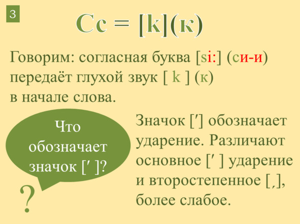 Звуки помещаются в квадратные скобки, а в круглых скобках мы находим подсказку приблизительного звучания с помощью букв русского алфавита.
