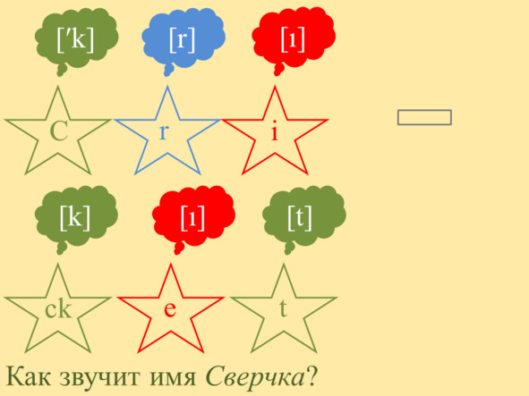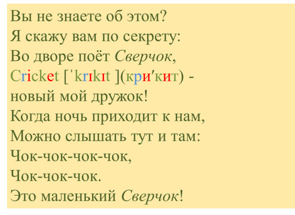 Звуки выстроились один за другим, каждый торопился занять своё любимое место. Они дружно пропели имя Сверчка: [k] (к) [r] (р) [ɪ] (и) [k] (к) [ɪ] (и) [t] (т).