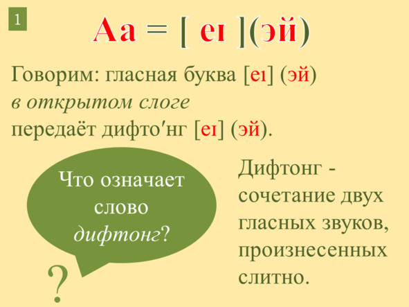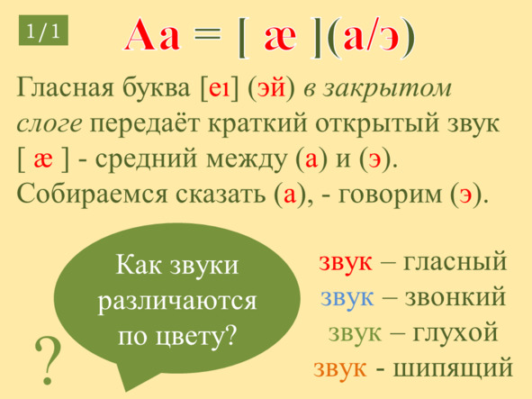 A: Я гласная буква Aa (эй). Когда слово оканчивается на согласный звук, я пою песенку [æ] (а/э) Звук [æ] (а/э) – гласный и носит красную одёжку.