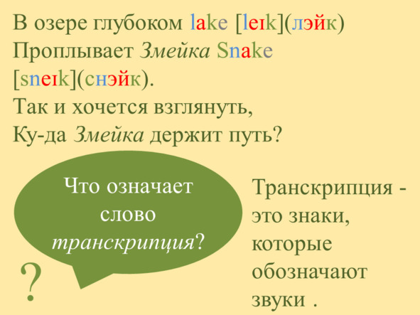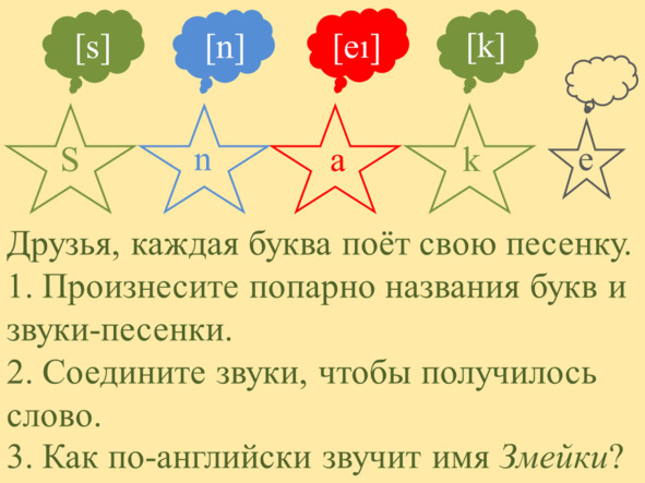 Звуки выстроились один за другим, каждый торопился занять своё любимое место. Они дружно пропели имя Змейки: [s] (с) [n] (н) [eɪ] (эй) [k] (к).