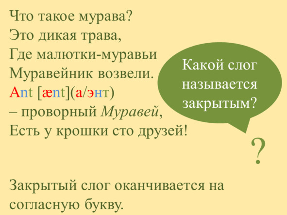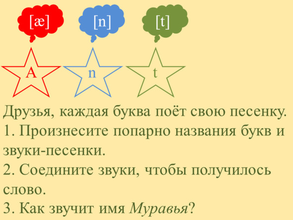 Звуки выстроились один за другим, каждый торопился занять своё любимое место. Они дружно пропели имя Муравья: [æ] (а/э) [n] (н) [t] (т).