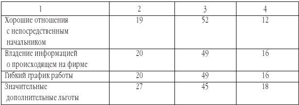 Условия работы – политика компании, технический надзор, отношения с руководством, межличностные отношения по горизонтали, заработок, безопасность труда, гарантия занятости, условия труда, статус, семейная жизнь.