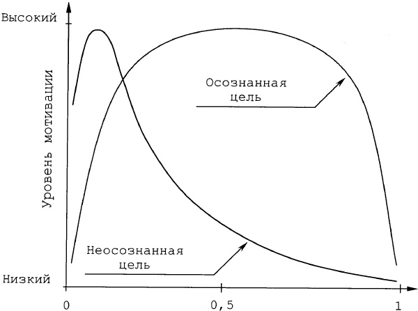 Если же трудные цели подробно объяснены и растолкованы, то начальный энтузиазм значительно ослабевает, и индивид медленнее «разогревается», постепенно активизируя свои усилия. Однако по мере осознания цели мотивация начинает увеличиваться, и результативность становится выше. При этом рост мотивации и производительности имеют значительно более продолжительный и устойчивый характер. Эта зависимость отображена на рисунке 1.3.