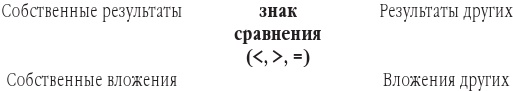 Согласно Адамсу, люди сравнивают соотношение между тем, что они получают в своей рабочей ситуации (своими результатами), и затраченными на это усилиями (своими вложениями) с соотношением результатов и вложений других людей. К результатам относятся заработная плата, статус и должностной уровень. Наиболее значимыми вложениями являются, в числе прочего, умения, знания, опыт, стаж работы и образование. Процесс сравнения выглядит примерно так, как показано на рисунке 1.4.