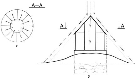 Рис. 1. Схема распределения энергетических потоков, обеспечивающих энергетическую защиту дома: а – горизонтальный разрез; б – вертикальный разрез