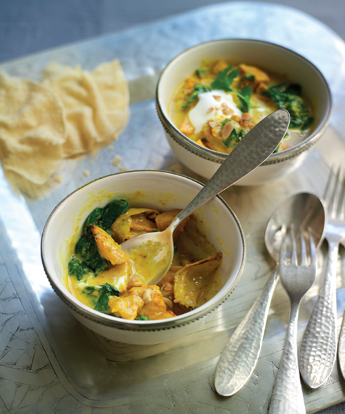 7 Remove the vegetables from the oven and add to the saucepan or casserole dish. Place on a medium heat for a few minutes to warm through, then stir in the spinach and spoon into bowls with a sprinkling of fresh coriander, a scattering of the toasted nuts and a spoonful of yoghurt or crème fraîche.