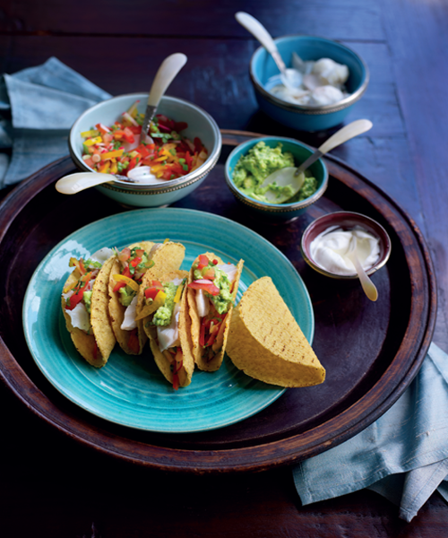 3 A few minutes before the fish are cooked, place the tacos in the oven to warm through, then bring to the table with bowls of the guacamole, salsa and crème fraîche. Cut or break up the fish into bite-sized chunks and place in a warmed serving bowl on the table. People can help themselves: just spoon a little from each bowl to fill the tacos, and eat!