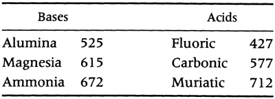 Thus, 672 equivalents of ammonia neutralized 427 of fluoric, 577 of carbonic and 712 of muriatic acids. Analysts now had a definite method of controlling the accuracy of their work and of calculating beforehand the composition of salts under investigation.