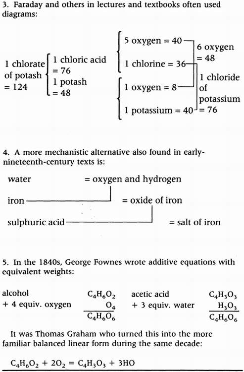 In a further ‘simplification’, which in practice wrought havoc in the classification of organic compounds and in communication between chemists, Berzelius in 1827 introduced ‘barred’ or underlined symbols to indicate two atoms of an element. (Since the bar was one-third up the stem of the symbol it involved printers making a special type, thereby losing one advantage over Dalton’s symbols; hence the use of underlined symbols in some texts.) The symbols for water and potash alum thus became, respectively:
