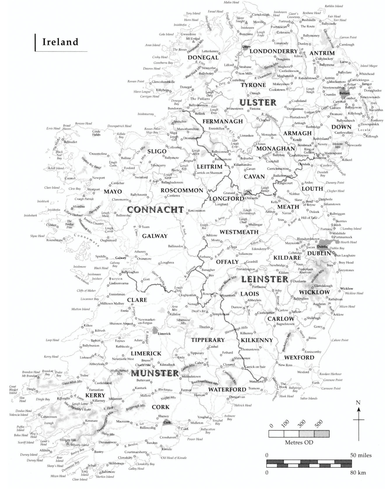 I have tried to write in a simple, easily understood language for the non-specialist. I would have preferred to use scientific names alongside common names throughout the text. However, in the interests of reducing the text length, scientific names may be found in the index. In several instances their use cannot be avoided when dealing with subspecies or derivations of common names. Also where ordinary names do not exist, as in the case of most mosses, liverworts, insects, marine invertebrates and numerous other organisms, there is no alternative but to use their scientific names. Place names have been taken from the maps of the Discovery Series of the Ordnance Survey of Ireland 1:50,000 published by the Government of Ireland and, where not available, from the 1:126,720 series. Following this reference source some hallowed names have been changed, e.g. ‘Ben Bulben’, Co. Sligo, becomes ‘Benbulbin’ and so on. However, concerning Connemara I have used ‘Twelve Bens’ in preference to the Ordnance Survey ‘Twelve Pins’. I have used the second edition of The Census Catalogue of the Flora of Ireland by Scannell & Synnott, published by the Stationary Office, Dublin, 1987, for all the common and scientific names of pteridophytes, gymnosperms and angiosperms. For other scientific and common names I have used the following Collins guides: Freshwater Life of Britain and North-West Europe (1986) by Fitter & Manuel; Sea Shore of Britain and Northern Europe (1996) by Hayward, Nelson-Smith & Shields; Insects of Britain and Western Europe (1986 and 1993) by Chinery; Butterflies and Day-flying Moths of Britain and Europe (1989) by Chinery; Mammals of Britain and Europe (1993) by Macdonald & Barrett; Ferns, Mosses and Lichens of Britain, Northern and Central Europe (1983) by Jahns; Fish of Britain and Europe (1997) by Miller & Loates and Birds of Britain and Europe (1993) by Peterson, Mountfort & Hollom. The following have also been used as references: The Flora and Fauna of Exmoor National Park – a natural history checklist (1996) by Giddens, Robbins & Allen (Exmoor Books, Dulverton), Handbook of the Marine Fauna of North-West Europe (1991) by Hayward & Ryland (OUP, Oxford), Atlas of the Bryophytes of Britain and Ireland by Hill, Preston & Smith (Harley Books, Colchester), Marine Algae of Northern Ireland (1994) by Morton (Ulster Museum, Belfast), Charophytes of Great Britain and Ireland BSBI Handbook No 5 by Moore (BSBI, London), A portable dictionary of the higher plants (1990) by Mabberley (CUP, Cambridge) and New Flora of the British Isles (2nd ed. 1997) by Stace (CUP, Cambridge).