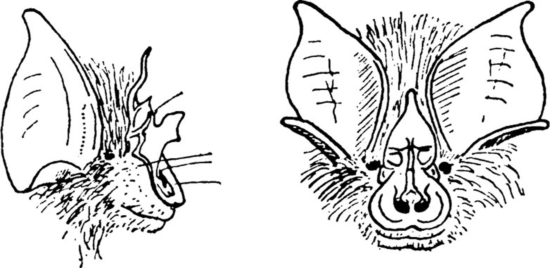 Two species of this family are members of the British fauna, the greater and lesser horseshoe bats, Rhinolophus ferrumequinum and R. hipposideros. They are characterised by the possession of ‘nose leaves’, thin fleshy outgrowths arising round the nostrils but overlapping the fur of the face with their free outer parts. Their structure is complex and better described by a drawing than by words; the part over the muzzle and round the nostrils is crescentic in shape, hence the English, Latin, and latinised Greek names of these bats.