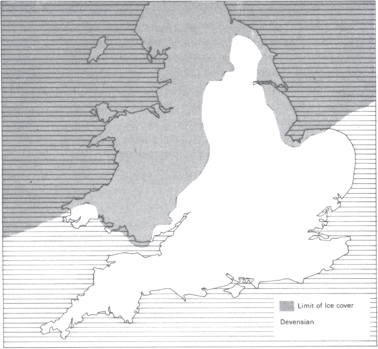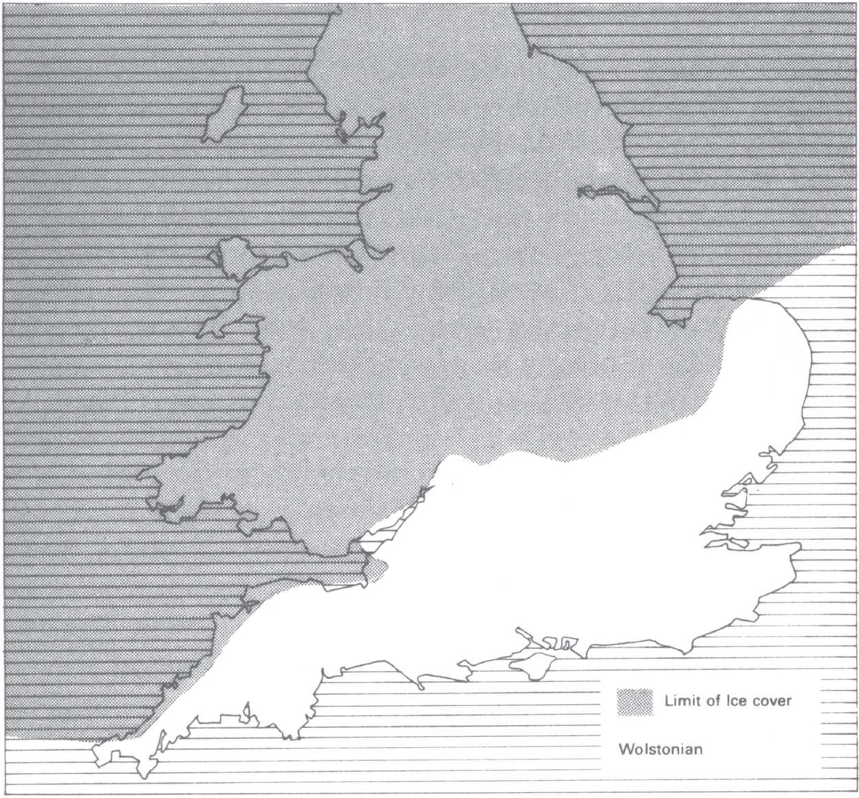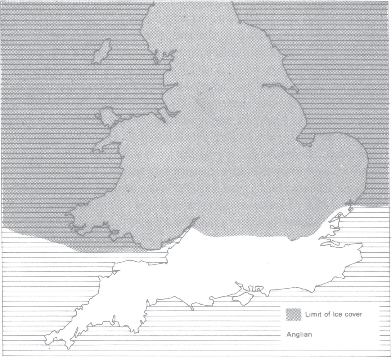 In the British Isles many of the typical pleistocene sites are found in East Anglia and take their names from nearby towns and villages of Norfolk, Suffolk and Essex. The last glaciation however takes its name from the Devenses, the ancient British tribe that lived over 50,000 years later in the area including Four Ashes in Staffordshire, the typical site.128 The succession of deposits is not complete, so that information is lacking about the earliest Pleistocene, and for a period of about a million years in the middle Pleistocene. In spite of these gaps the deposits indicate alternating colder and warmer phases but give no unequivocal evidence of glaciation, with ice sheets covering much of the country, until comparatively late in the epoch when ice cover reached its maximum during the Anglian glaciation, corresponding with the Elster glaciation of northwest Europe and the Mindel of the Alps.