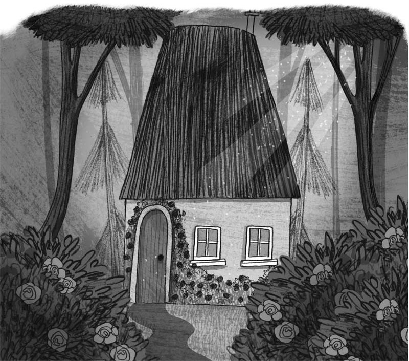 A few minutes later, the golden path faded away and the foursome found themselves in a little clearing. Cinders looked up and saw stars in the night sky. It was much later than she’d realised. In the middle of the clearing was a sweet little cottage. The walls were white and the roof was thatched and there was an archway of roses growing round the wooden front door.