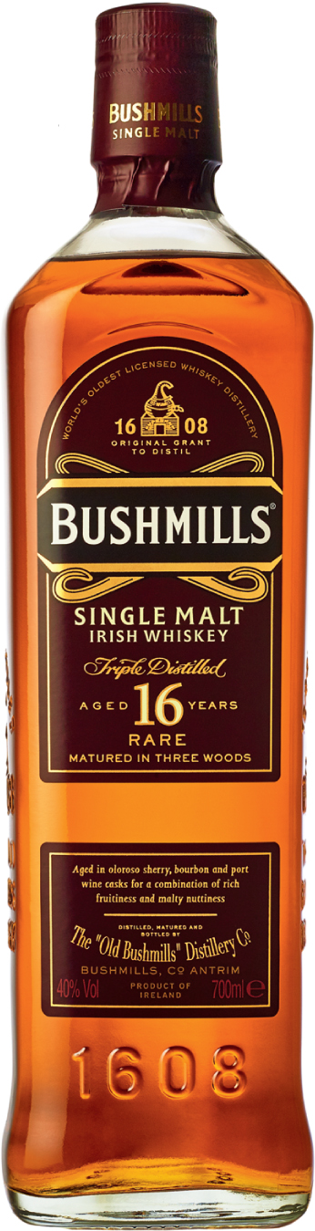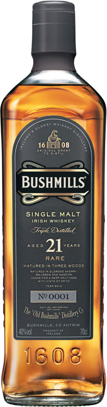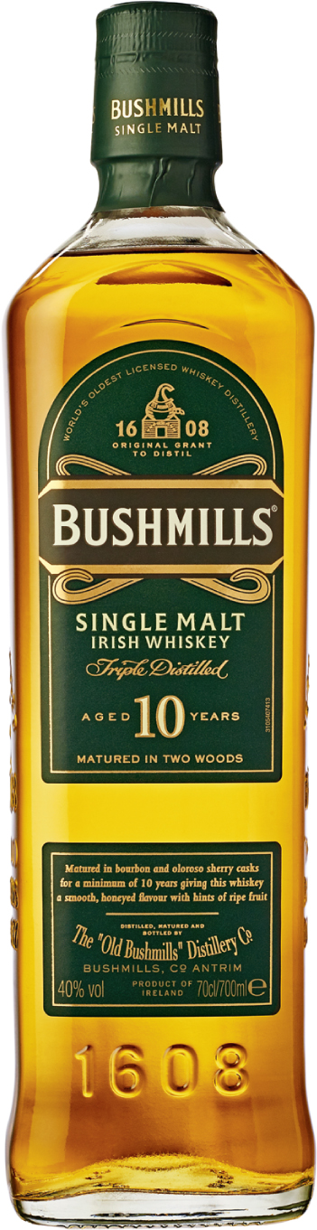 Triple-distilled, like all of the Bushmills family, this 100 per cent single malt is matured in bourbon and sherry casks for at least 10 years. It’s a signature product in the Bushmills range and cuts to the heart of what Bushmills is famous for – rich, warm, honeyed, satisfying flavours. Chocolate and vanilla dominate and create a wonderful profile for the first of a trio of superb single malts. Bottled at 40 per cent.