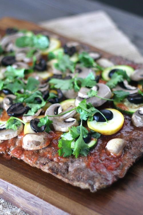 1. Llene la masa con salsa de tomate, puré de aguacate, champiñones en rodajas, zanahoria y espolvoree con un poco de aceite de aguacate.