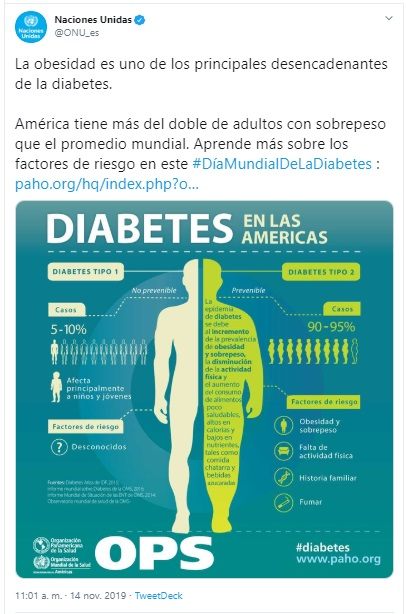 @ONU_es. (2019). Nações Unidas no Twitter: “A obesidade é um dos principais gatilhos da diabetes. Os Estados Unidos têm duas vezes mais pessoas acima do peso do que a média mundial. Saiba mais sobre fatores de risco neste #DiaMundialDaDiabetes : http. Acessado em 4 de abril de 2020 em https://twitter.com/ONU_es/status/1194918142167932928