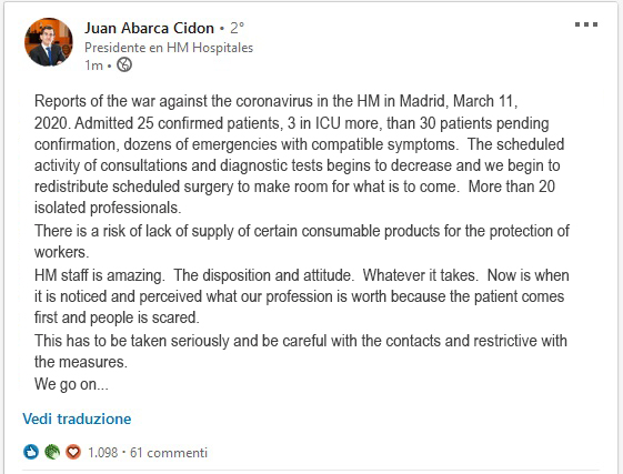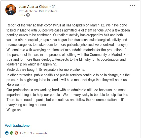 Illustration 12 LinkedIn Report of the war against coronavirus in HM hospitals on March 12. LinkedIn