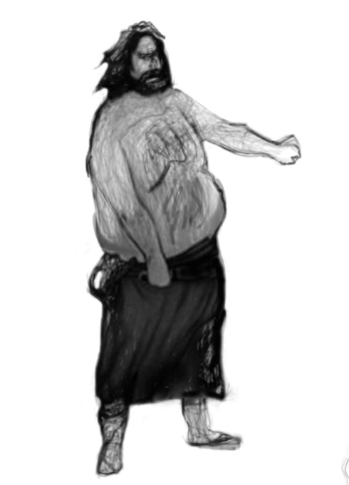 Cuando nos acercamos a la cabaña, la puerta crujió en sus bisagras de cuero y salió un repulsivo hombre buey. No llevaba más que la parte inferior de una túnica atada con una cuerda bajo su enorme vientre, y un par de botas negras. Su cabeza peluda se apoyaba en hombros redondos, como si no tuviera cuello. Nunca había visto a nadie con tanto pelo. Cubría su pecho, su vientre y la mayor parte de su cara. Probablemente su espalda también, pero no quería ver más.