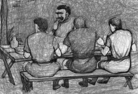 Justo después del anochecer llegaron dos soldados pidiendo la cena. Llené sus cuencos con estofado y les serví rodajas de melón, junto con pequeños trozos de pan. Vinieron más, y pronto todas las mesas estaban ocupadas. Me apresuré de un soldado a otro con los jugosos cortes que Yzebel iba sacando del cerdo asado.