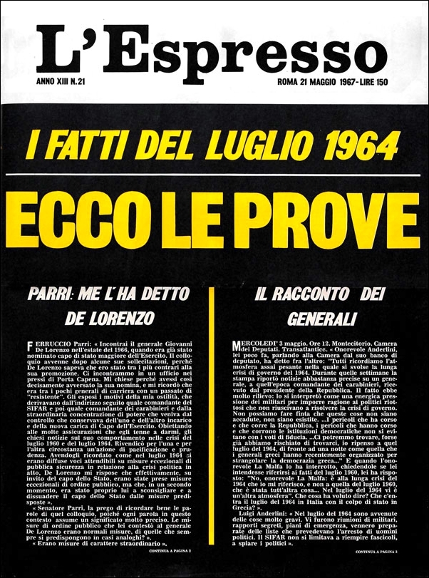 Después de mayo de 1967, y gracias a los artículos de L’Espresso, se constituiría por fin una comisión parlamentaria de investigación sobre los hechos. ¿Sus conclusiones? Se habría tratado de un plan de emergencia especial tutelado por el orden público, «un lamentable desvío», pero no un intento de golpe de Estado.