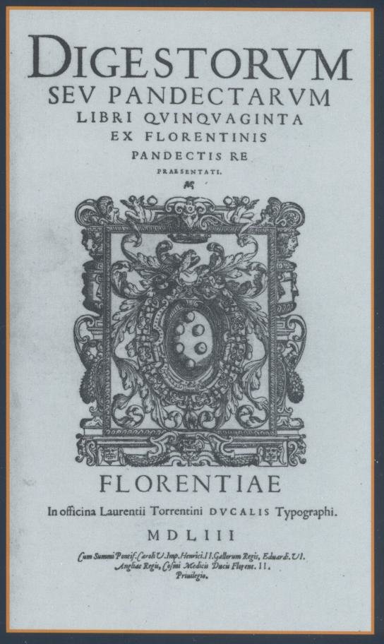 Рис. 1. Дигесты Юстиниана (титульный лист издания 1553 года) (источник изображения: https://commons.wikimedia.org/wiki/File:Digesta_1553.jpg)