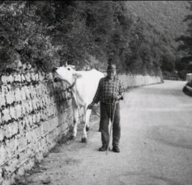 Anni ’50, Giuseppe e la mucca. Molte famiglie possedevano una o due mucche per il latte, il vitello e il lavoro nei campi
