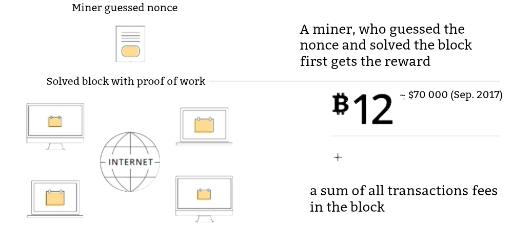 Un miner ottiene una ricompensa per l’estrazione di un blocco. Attualmente, la ricompensa è di 12 BTC. Cioè, se introduci un blocco ben formato nel sistema, otterrai una tale ricompensa. A proposito, il primo blocco (Genesis) è stato creato da Satoshi Nakamoto. Chiunque potrebbe trovarlo e ottenere 50 BTC per esso. Oggi, la ricompensa per un blocco formato correttamente inizia a diminuire. Si dice che raggiungerà un valore infinitesimale entro il 2140.