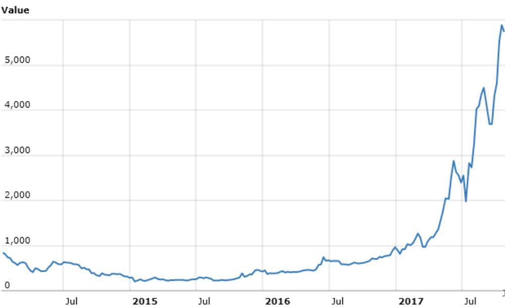 Questo grafico mostra che i Bitcoin hanno avuto i suoi alti e bassi. Tuttavia, è cresciuto di più volte dal 2016.