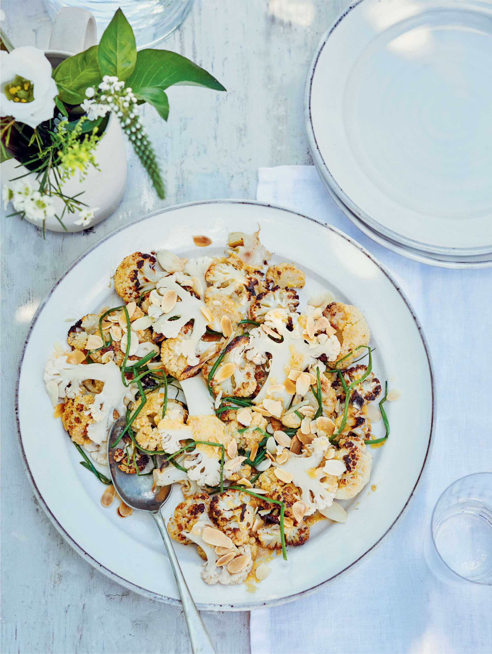 6 When the cauliflower florets are cooked, place them on a large serving platter. Add the chives to the roasting tray and place back in the oven for 1 minute, to gently wilt them, then spoon them over the cauliflower. Drizzle the almond butter over the top and top with the pickled cauliflower slices and reserved toasted almonds.
