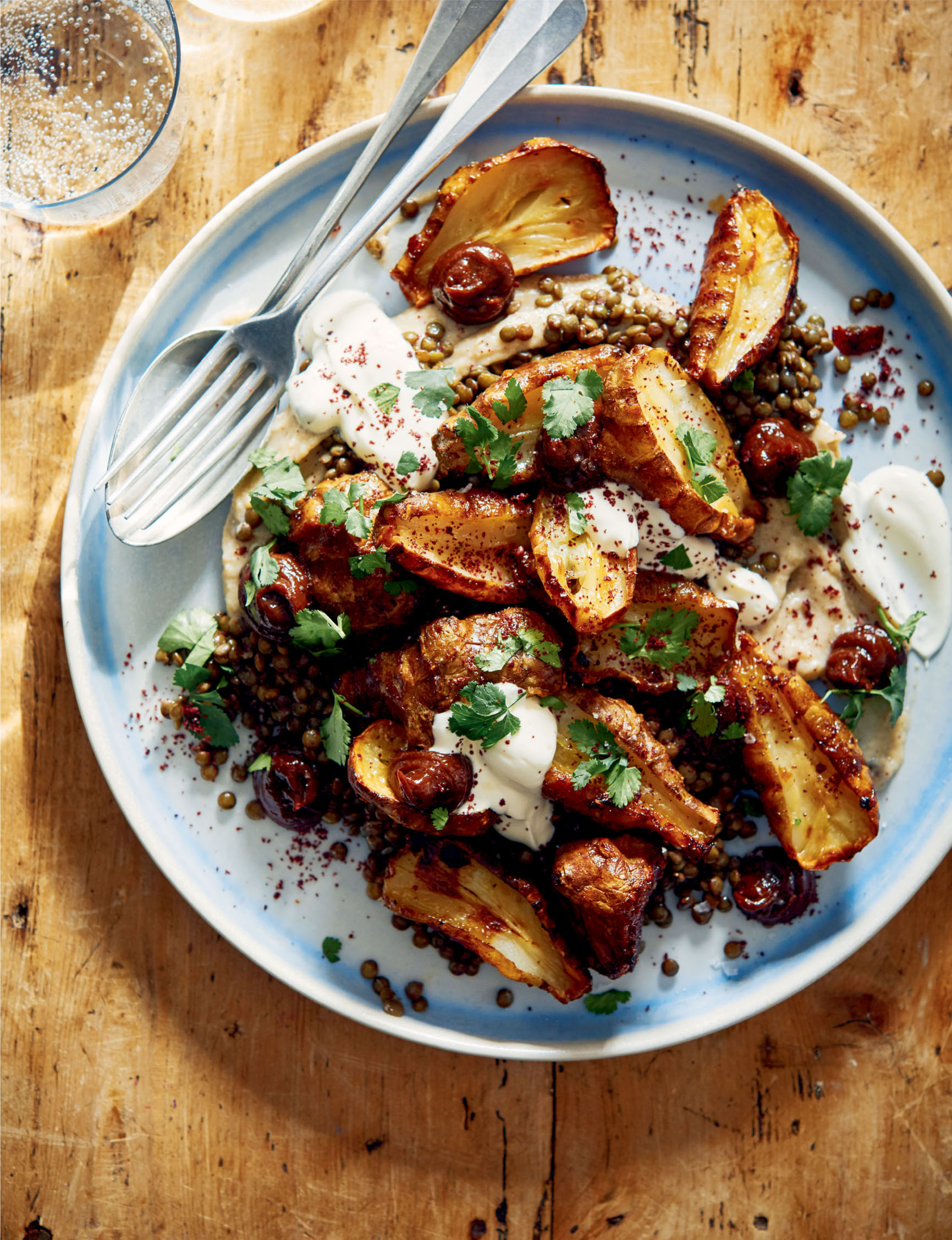 Roasted Jerusalem Artichokes with Prunes, Lentils and Sour Cream