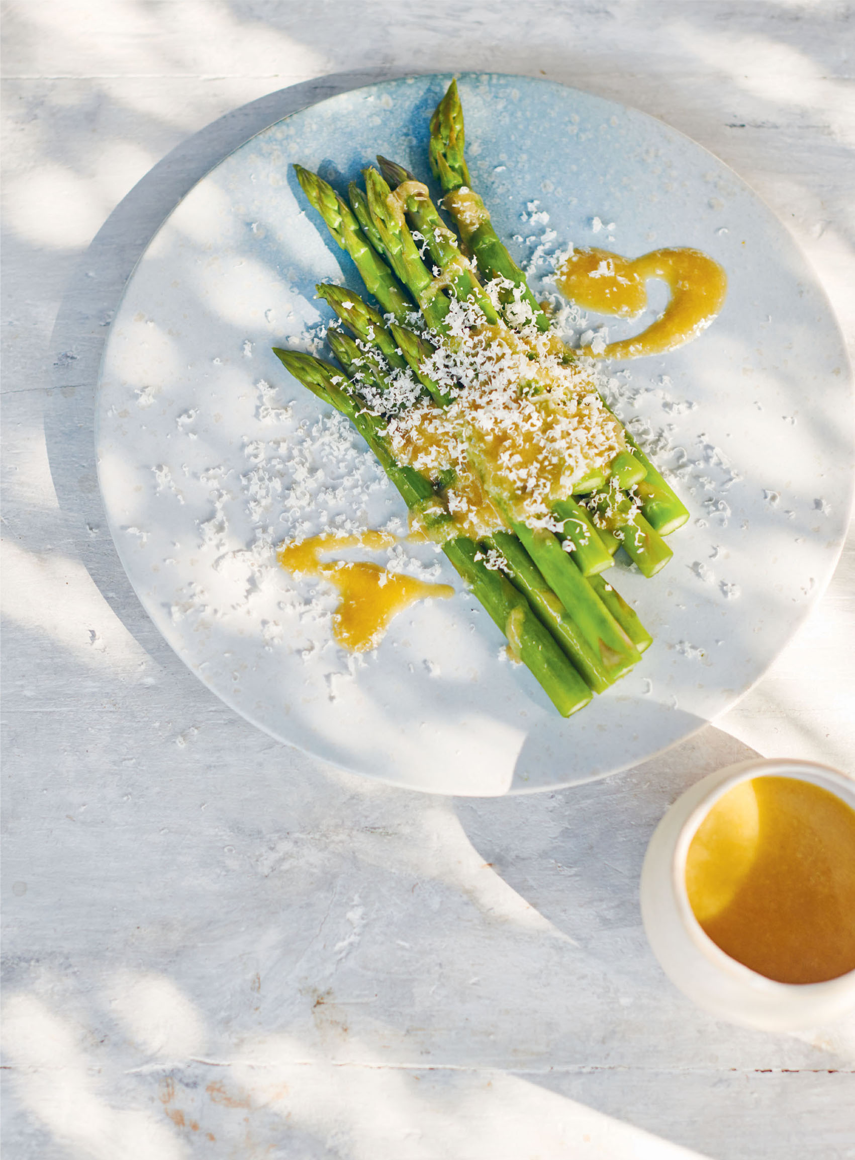 The arrival of British asparagus is one of the first signs of spring that I most look forward to, and I like to take advantage of its fleeting season as often as possible. Bagna cáuda originates from Piedmont in Italy and is traditionally a pungent sauce made with anchovies, olive oil and garlic. It pairs so well with the delicate flavour and texture of asparagus. Heaped with freshly shaved Parmesan, it is a dish I can eat over and over again.