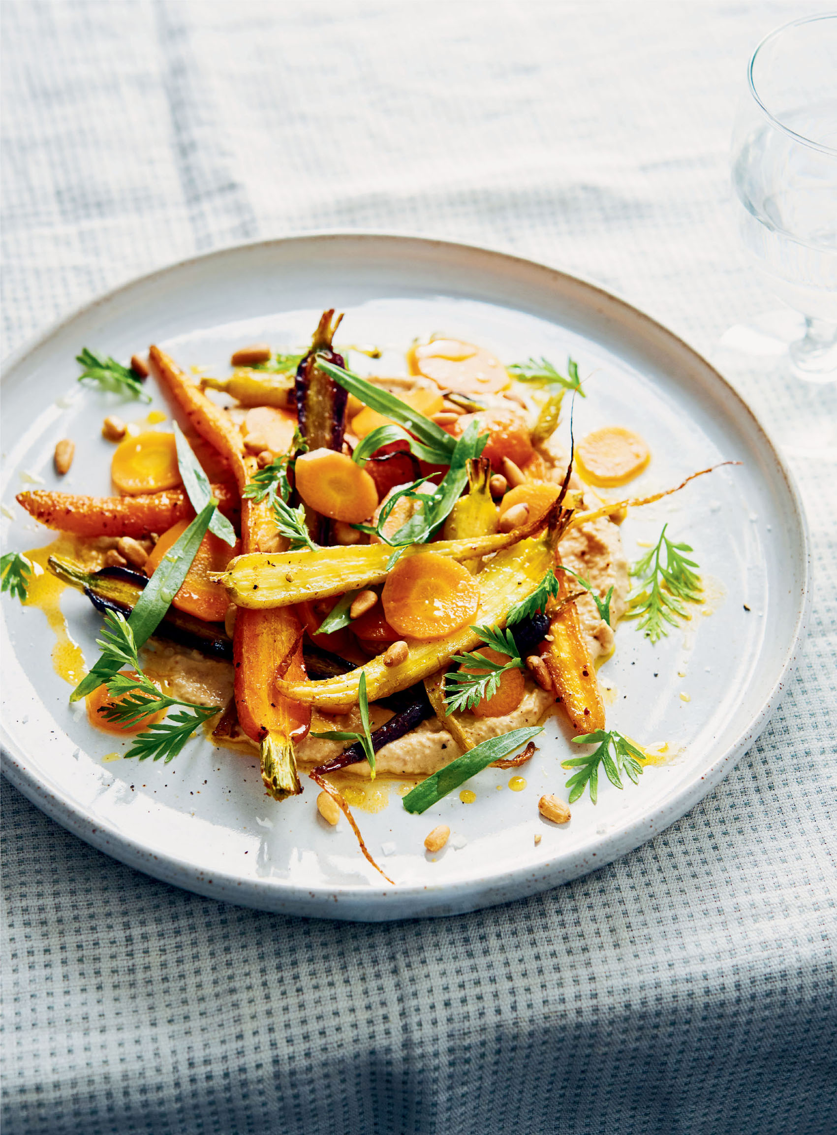 7 To assemble the dish, place the remaining sliced carrots in a bowl and dress them with the carrot vinaigrette. Spoon the pine nut purée onto 4 plates. Top with the warm roasted carrots, pickled carrots and dressed carrots. Finish with the remaining toasted pine nuts, some reserved carrot tops and the tarragon leaves.